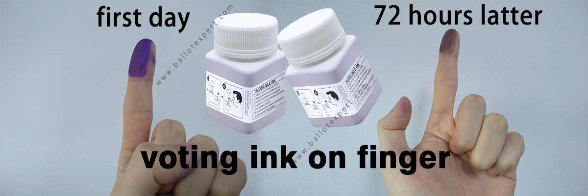 Voting ink on finger, also known as semi-permanent ink or dye, is applied to the voter's finger by election officials after the voter has completed their ballot at the polling station to prevent multiple voting. This is an effective method to prevent electoral fraud in countries where there is no standardization or institutionalization citizen identification documents.